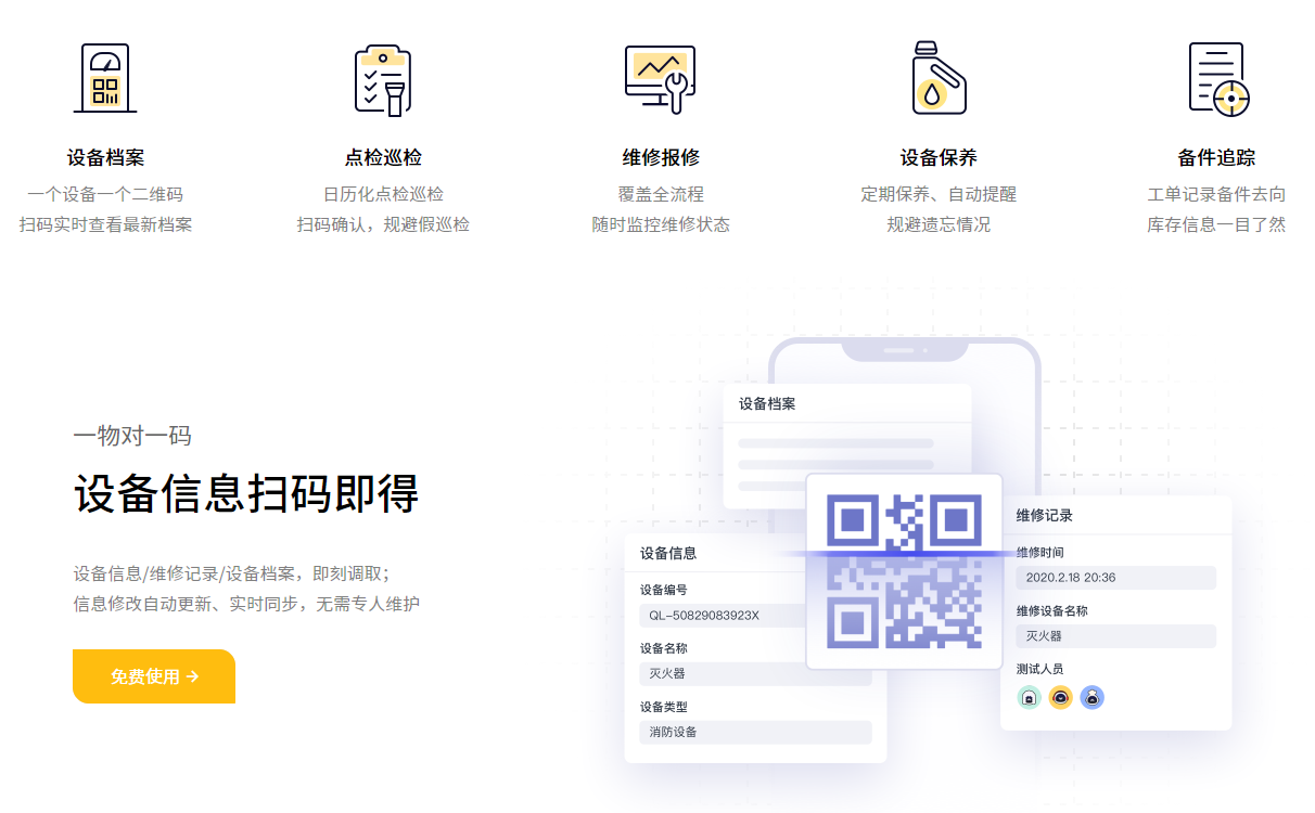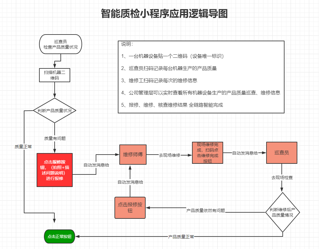 1、每台设备一个二维码(微信一物一码),产品质检员发现质量问题,扫码即可报修。