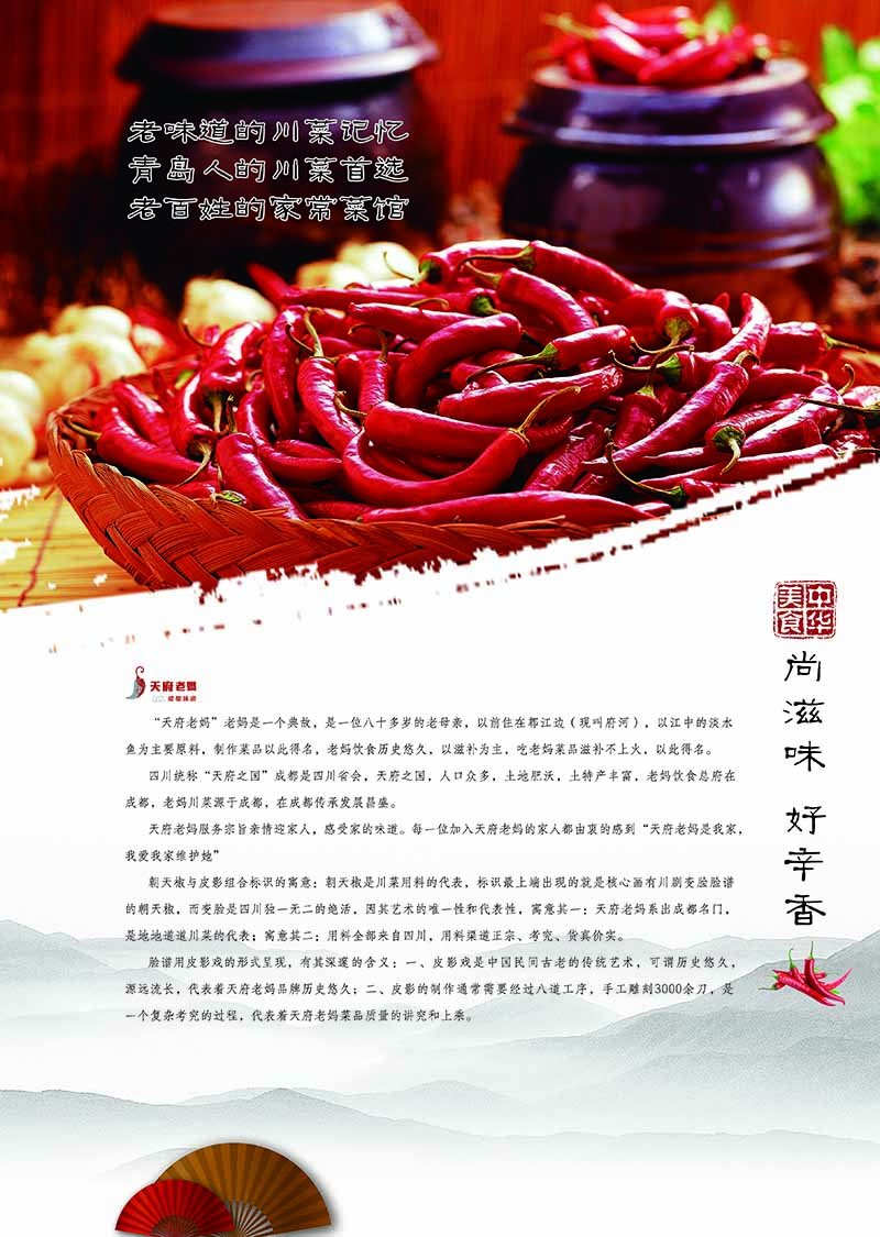 天府老妈服务宗旨亲情迎家人,感受家的味道。每一位加入天府老妈的家人都由衷的感到“天府老妈是我家,我爱我家维护她”朝天椒与皮影组合标识的寓意:朝天椒是川菜用料的代表,标识最上端出现的就是核心画有川剧变脸脸谱的朝天椒,而变脸是四川独一无二的绝活,因其艺术的唯一性和代表性,寓意其一:天府老妈系出成都名门,是地地道道川菜的代表;寓意其二:用料全部来自四川,用料渠道正宗、考究、货真价实。